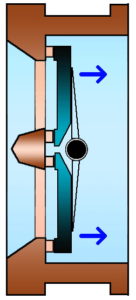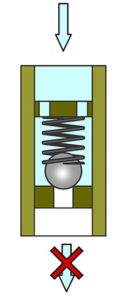 In reverse flow, the shut-off device is pressed against the seat, and flow becomes impossible, as shown in the photo.