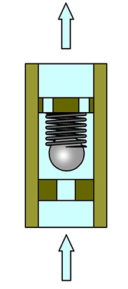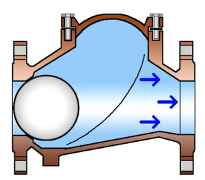 The movable locking device moves freely inside the product. If the flow is moving in the desired direction, the ball moves away from the seat, opening the gap to the flow.
