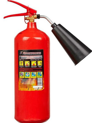 Carbon dioxide fire extinguisher - a red balloon, charged with liquid carbon dioxide, under high pressure, indicated by the abbreviation OU and a number. The figure is the mass of the fire extinguishing agent charge. The main task is to bring down the flame and isolate the source. You can extinguish office equipment, household appliances under voltage. For an apartment or a small house, OU2 and OU3 are considered the norm.