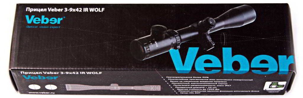 The Veber PO 3-9 × 42 IR WOLF is a versatile approach shooting model. The device is equipped with a metal (aircraft-grade aluminum alloy) waterproof housing (protection class IPX7). The tube has a matte surface with a central diameter of 30 mm. The scope provides gradual magnification from 3x to 9x, and is filled with nitrogen to prevent lens fogging.