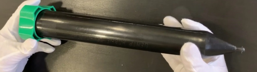 The device looks like a huge sharpened pencil. The body is black, the valve cap is green. The case is durable, water-repellent, allows you to work in all weather conditions, except for freezing temperatures. Scares away all pests living underground.