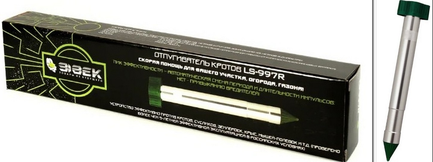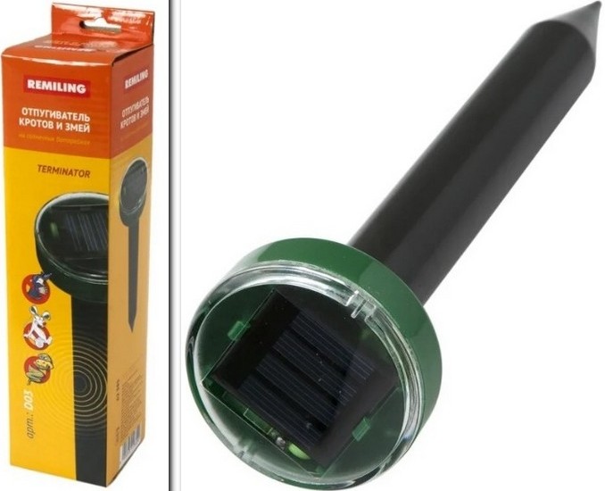 A small, in height, "nail" size, on the head of which there is a solar battery. Effects to a depth of 20 centimeters. The rod is made of aluminum, so it will not rust if moisture gets on it. To get a quick result, you can use several of these devices. The device is endowed with high frequency of operation and coverage of the territory.