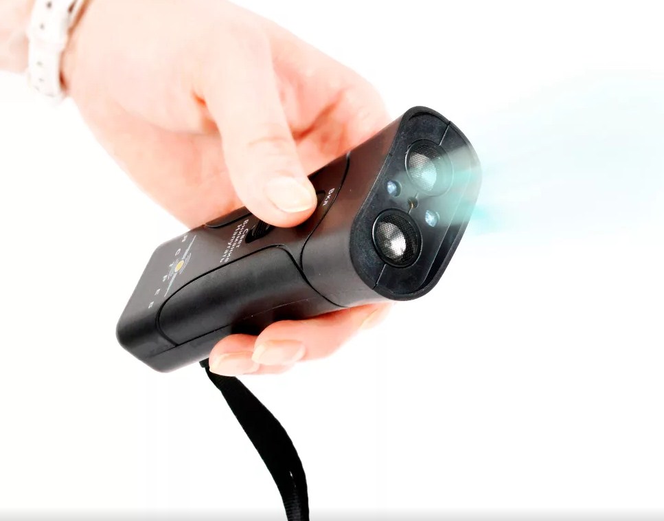 A pocket-sized device that is easy to carry. It has two emitters with a power of 125 dB each. Distance covered - 20 meters. In addition to the based function, you can use a siren and a flash. It can be used to protect against burglars, as well as on a hike to fix your location. The device has a signal cable that can be passed through the bag and connected to the repeller, this action will help in finding stolen items. Lightweight, fits easily into a small purse, pocket or purse. Powered by a battery that can be charged via a conductor.