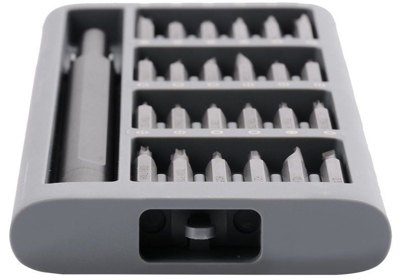This screwdriver is distinguished by the presence of a huge set of bits, consisting of 24 units. Such a set is ideal for precision work in any conditions, both for beginners and professionals. All the constituent elements of the screwdriver are perfected at the highest level, the bits fit into the groove without backlash.The tool, along with all the attachments, is perfectly located in an ergonomic case, the material for which is anodized aluminum, and the top layer is covered with an anti-corrosion layer. As for the tool itself, it is made in accordance with European standards and has comfortable edges that contribute to a comfortable grip. Lightness and ease of operation is ensured by a long, durable stock rod. The back of the screwdriver is equipped with a cap, under which the bits are located. It can be easily unscrewed with a finger. All bits have a magnetized structure and are rigidly fixed in the grooves.