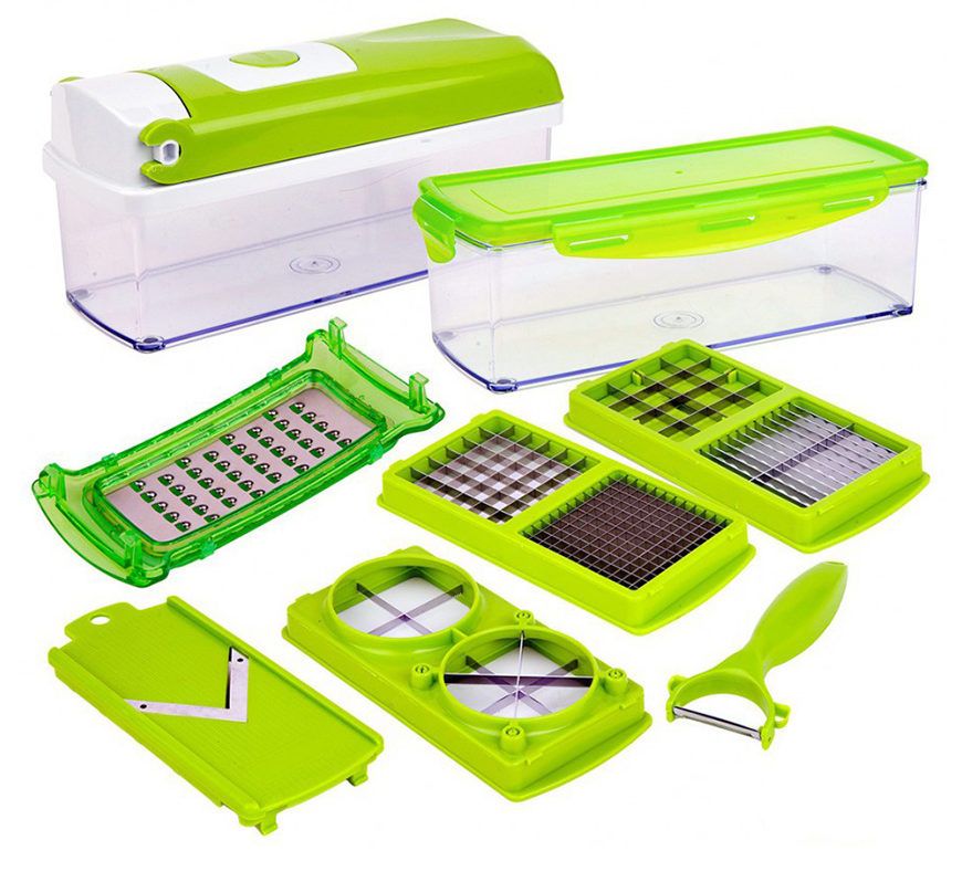 | 5 | Nicer Dicer Plus | Cost from 600 rubles | Device type - mechanical vegetable cutter; Number of attachments - 7 (for cutting into small, medium, large cubes, strips, for cutting into slices, classic grater, shredder grater, vegetable peeler); The material is plastic. | low price; a large number of attachments; simplicity and ease of use; compact size (weight is 430 grams). |