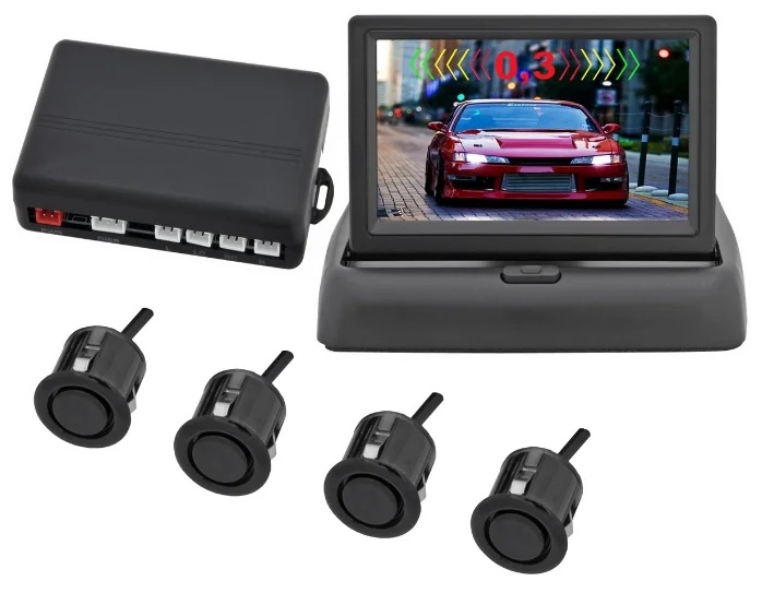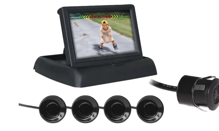 The complete set of this model includes an LCD monitor, a camera, 4 rear parking sensors, a control unit and a connecting cable. The monitor will display information about the distance to the object, its direction and the image from the rear view camera. Also, when approaching an obstacle, there will be a sound signal. As you approach an obstacle, the volume of the signal will increase. Information will be given about the distance up to 2.5 m. The monitor screen size is 4.3 inches. A 120-degree camera will provide good visibility. It is resistant to moisture, shock, vibration and bad weather conditions. When reverse gear is engaged, the system is activated and diagnosed. If any object enters the detection area, the distance information will be immediately visible on the monitor.