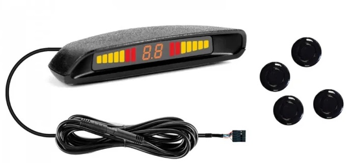 The complete set of this model includes 8 parking sensors, a monitor, a control unit and a connection cable. There are 4 front mount sensors and 4 rear mount sensors. A forced shutdown function is provided for the front sensors. The display measures 2.4 inches and is divided into several segments.When an obstacle is detected, it will be displayed on a specific segment of the monitor. The distance to the object can be determined by changing the color of the indication.