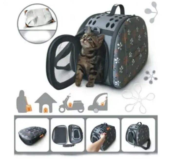 The model of a folding carrier for cats and cats has dimensions of 46x32x30 cm.The average price of this model on the Internet is 4450 rubles. The bags are shaped like standard fabric bags, but have a strong EVA reinforcement in the outer core and fold into a flat case after use.