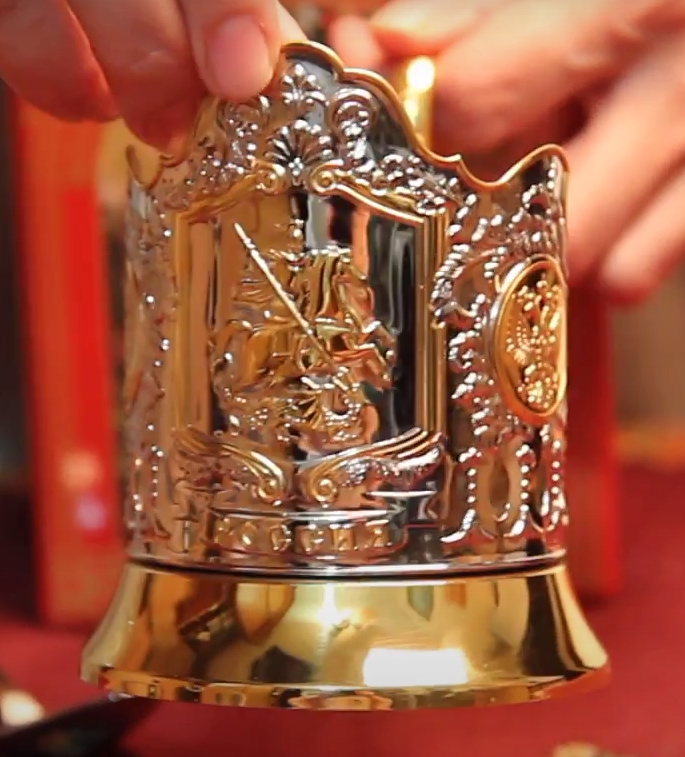 Bronze by the gilded tea set, where we see the notorious George the Victorious. The Holy War, which has long been considered the patron saint of the capital, is traditionally depicted on horseback, striking a serpent with a spear, his image is decorated with precious metal by hand. Below we see the inscription "Moscow", in general, the product looks majestic, and the presence on both sides of the great martyr of state symbols makes it an excellent present in the official style.