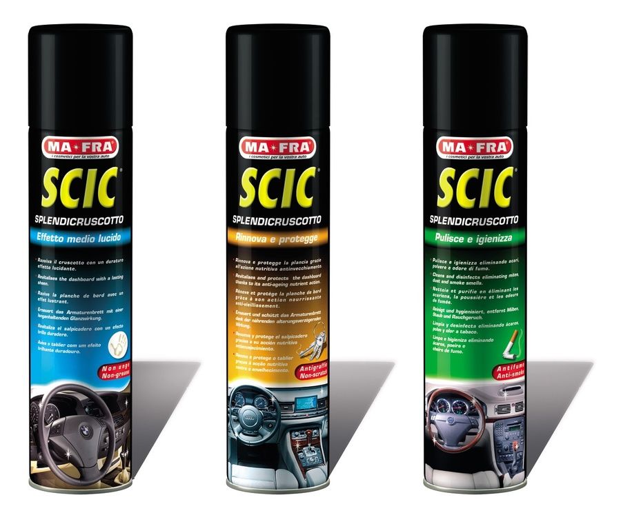 The Italian protective agent MA-FRA SCIC took the 1st place. The product is enclosed in an aerosol can of various capacities. With this type of packaging, it is more convenient to apply polish to a sponge and rub. MA-FRA SCIC BLUE SPRAY and MA-FRA SCIC ORANGE polish is suitable for plastic surfaces. It contains substances that destroy insects. Anti-static properties help keep the treated surface clean for a long time without generating dust. The formula of the product cleans, disinfects, restores the color and appearance of the surface, protects against aging and prevents the formation of minor scratches at the same time. Suitable for dashboard and other auto interior. SCIC ORANGE - glossy, it can be used on panels of different shades, dark and light.