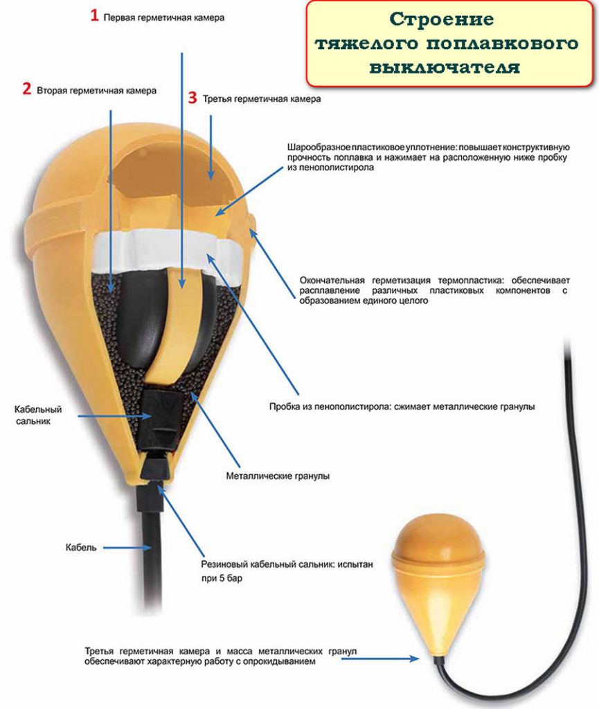 Inside, the space of the float-switch body is filled with air, therefore, the device constantly strives to float and take the highest possible position in relation to the bottom of the tank. If the level of the liquid in the container falls, then the float, accordingly, sinks closer to the bottom.