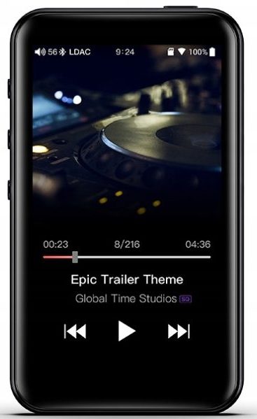 A device with a sampling rate of 32/384 without internal memory. Inside there is a slot for a 256 GB card. Graphics, video files, voice recorder mode are not supported. The player plays basic formats: MP3, WMA, OGG, AAC, FLAC, APE, Apple Lossless, WAV, PCM, AIFF, DSD, DFF, DSF, SACD ISO. The player is connected to the computer using USB generation 3.0. Music can be listened to wirelessly via Bluetooth, A2DP. There are also line and coaxial outputs, USB-Host. The display has a diagonal of 2.4 inches, a resolution of 360x400. The body cover is metal, the gadget is controlled by a touch panel. The menu provides a sleep timer, which is convenient for those who like to listen to music while lying in bed. In the process of listening, you can delete unnecessary tracks, clean albums. The package contains a cheap silicone case and a spare film for the screen (the film is also glued to the player itself).
