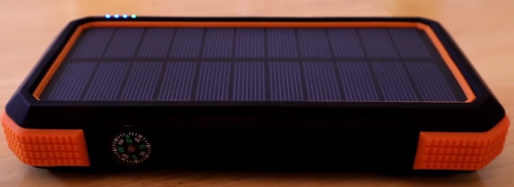 A monocrystalline solar panel with a power of 1.5 W and a lithium-polymer battery with a capacity of 8000 mAh are installed here. To charge two gadgets at the same time, the case has two micro USB connectors with a maximum current of 1 A and 2.1 A. The voltage of the input micro USB connector is 5 V, the current is 1.5 A. The remaining charge is shown by 4 LED indicators. On average, the price of this model is 3616 rubles.