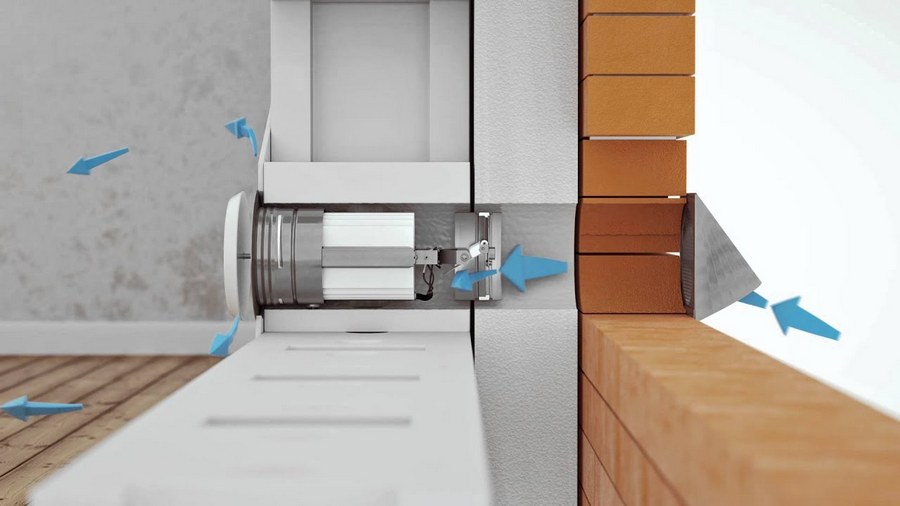In the middle segment, the most popular is wall inlet valve, which is installed by drilling holes in the wall. This system has an increased throughput (up to 50 cubic meters per hour). There are models equipped with a filter that cleans the incoming air at a mechanical level - traps fine fractions of dust and dirt, insects, fluff, etc. The downside may be that with improper installation, during the onset of low temperatures, the valve installation site may freeze up, and air heating in this system is not provided.