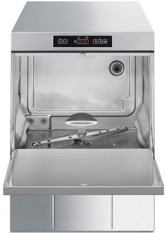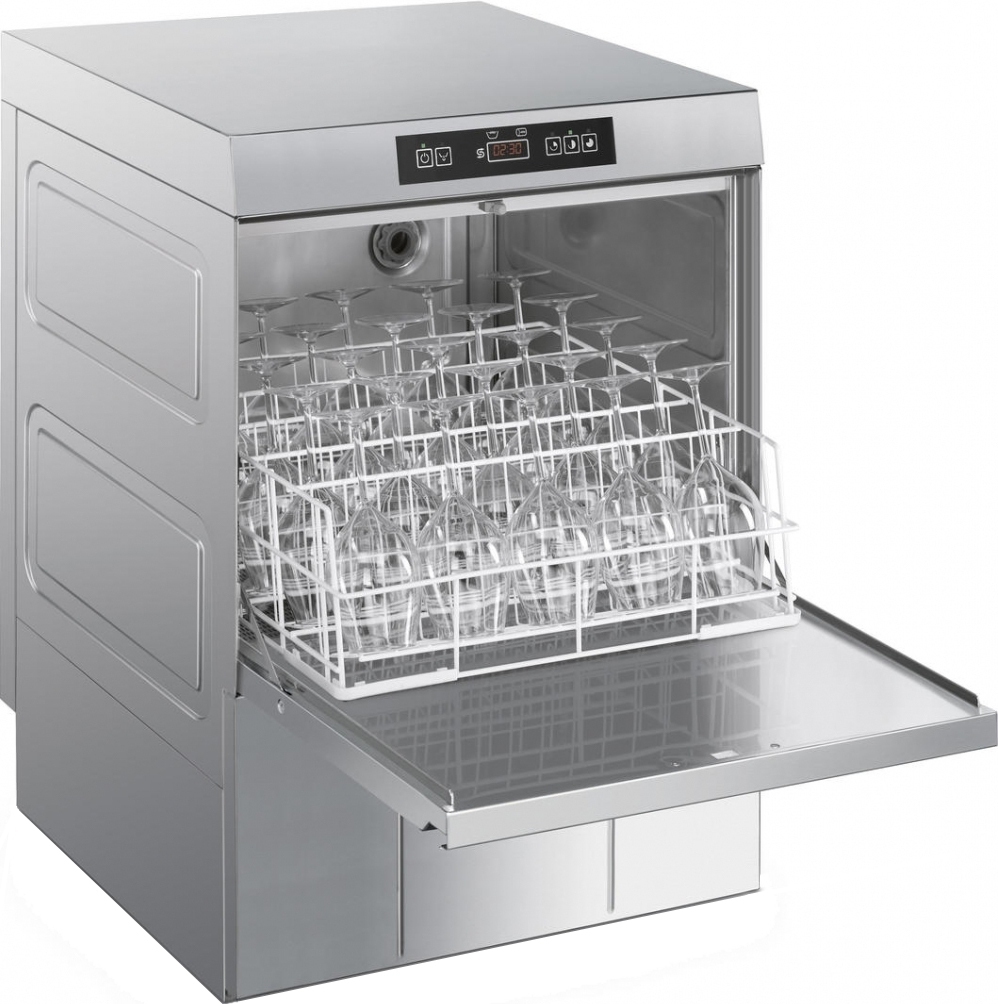 UD500DS is a front-type model of the same Italian manufacturer - concern Smeg from the ECOLINE series. A freestanding dishwasher with a small size (almost square: 58 x 60 cm and a height of 82 cm), which allows it to be used in a small kitchen area. At the same time, the device is characterized by high productivity and is capable of serving up to 40 cassettes with dishes within 50 to 50 cm in one hour. The device body with single walls is made of AISI 304 stainless steel. The machine is equipped with two washing programs with a short (90 seconds) and medium cycle (150 seconds). This ergonomic unit with low consumption of electricity and water is recommended for dining rooms, cafes, restaurants and hotels with an average flow of visitors.