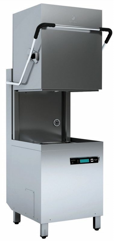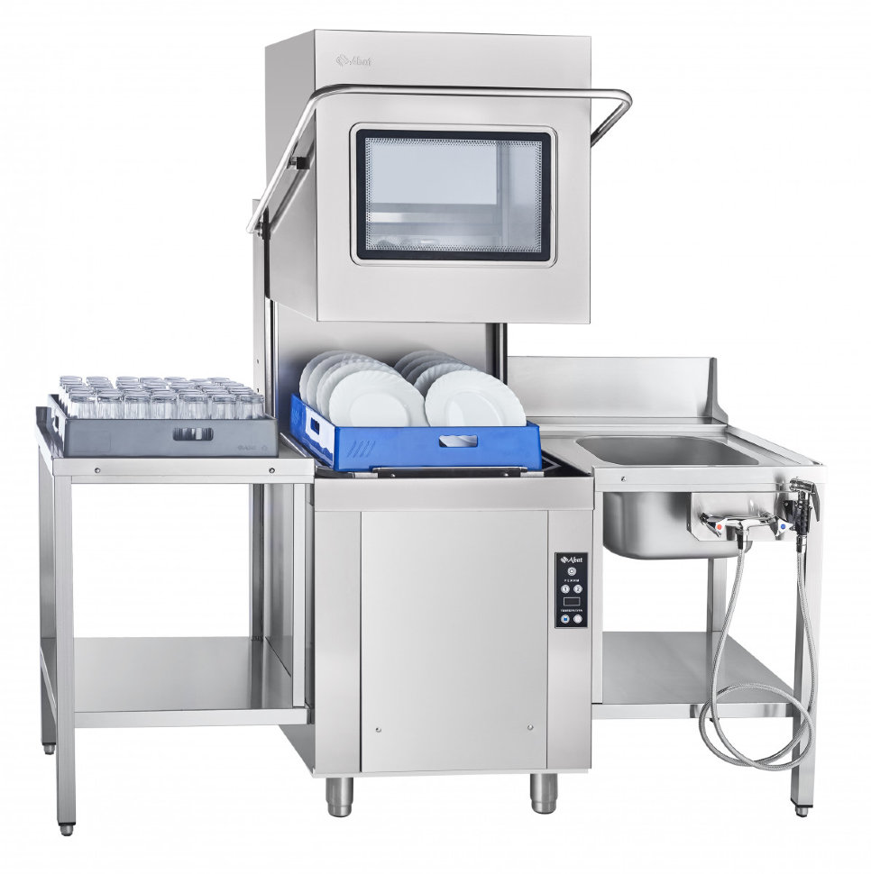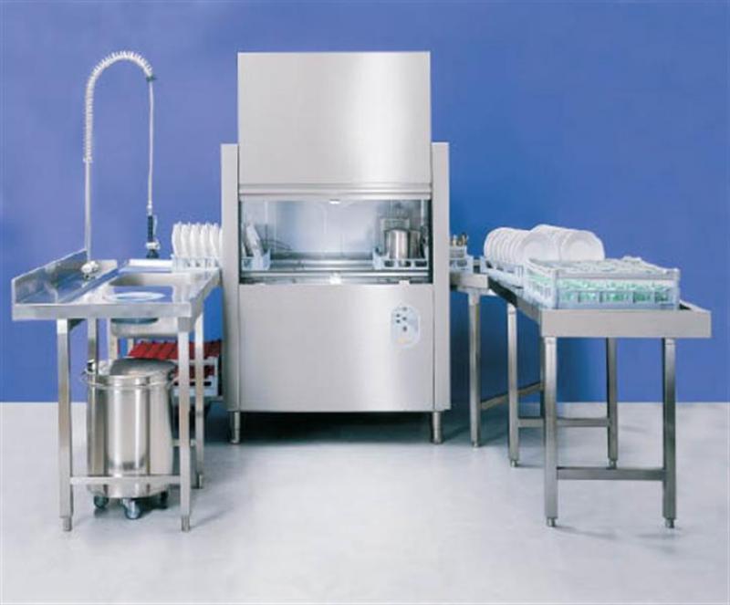 Dome dishwashers are entire technical systems. They are equipped with sinks, work surfaces and rinsing showers. In turn, the main wash of the apparatus consists of two parts: a base (for loading dishes up to 1500 units per hour) and a dome (covering the base).