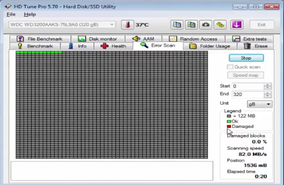 It is possible to check the surface of the HDD. During this operation, you can choose one of 4 options. By default, there will be a simple error check. You will be able to view information about the verification progress and the blocks being tested.
