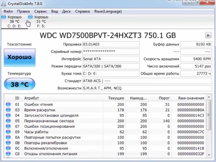 With the help of CrystalDiskInfo, you can read and get information about errors that will occur in the near future on the surface of the hard drive. This will make it possible to copy important information to another medium, before the failure occurs. Thus, all valuable data will remain safe. HDD status is assessed by testing SMART attributes.
