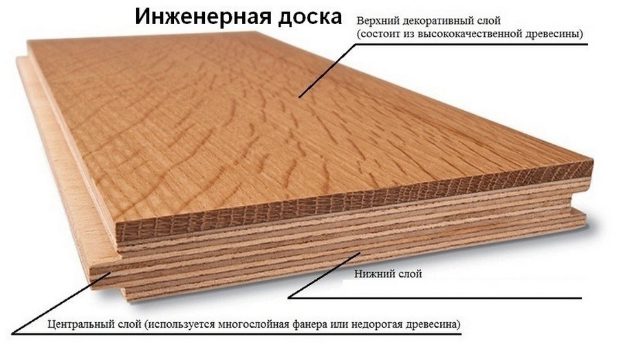 By the number of layers, the board can be two or three layers. The first layer is always valuable wood species, and the next one is cheap wood or plywood, which is laid perpendicular to the fibers of the top layer. In the case when a third layer is present in the structure, it is laid parallel to the veneer fibers.
