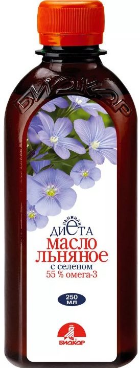 "Biokor" is a Russian manufacturer (Penza) of healthy food products and dietary supplements with almost thirty years of history. Since 2002, the company has independently grown raw materials for its products. Several types of wholesome food are made from flax seeds: crispy plates, flax seeds and, of course, oil. The latter is presented in two versions: "Tsarevshchino" 250 ml and with selenium 250 ml. among buyers, the second is more in demand, which we will consider.