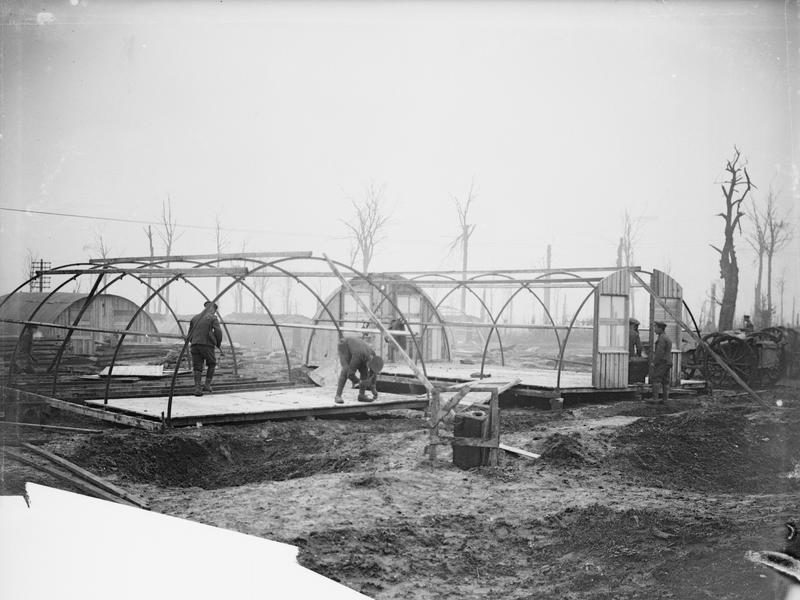 Corrugated iron huts, also known as Nissen huts, have been under construction in Bazentin, France since 1916. Photo courtesy of the Imperial War Museum, London, UK.