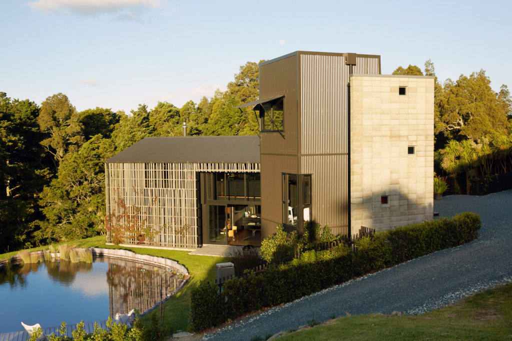 Inland House can be interpreted as a “modern farmhouse” that seems appropriate for its location, as housing is hidden from human eyes in a valley in Auckland, New Zealand. Corrugated iron siding was chosen exclusively for the tallest part of the three structures and balances the sleek look with rustic materials.