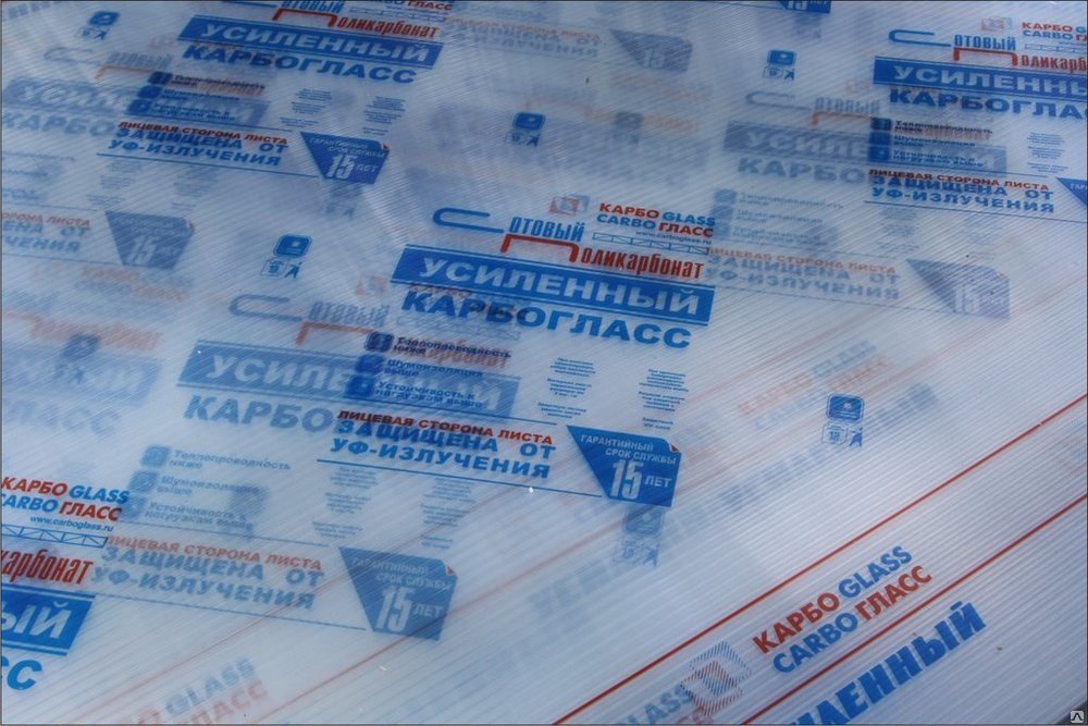 Carboglass offers consumers one-, two-, three-, four-chamber versions of polycarbonate, as well as reinforced, which other manufacturers on the country's market cannot offer. Thickness of sheets 4, 6, 8, 10, 16, 20, 25 mm. Sizes 2.1 by 6.0 and 2.1 by 12 m. 15 colors are available (transparent, white, bronze, brown, red, yellow, turquoise, etc.). All polycarbonate from this manufacturer is coated with a protective UV layer using coextrusion technology.