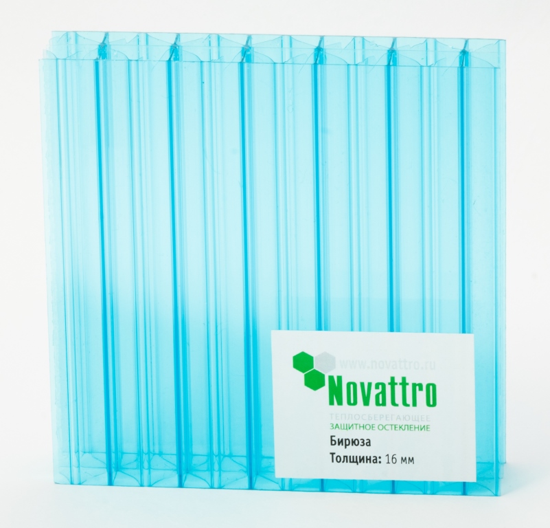 Novattro is produced in two sizes 2.1x6.0 and 2.1x12.0 m. Thickness 4-32 mm. Depending on the thickness, the sheet can be one-, two- and four-chamber, and its structure is 2R or 2Rx. The sheets are available in 12 colors, as well as in Decor format with patterned inclusions. The protective layer against UV radiation is 40-60 microns. Light transmittance up to 81%.