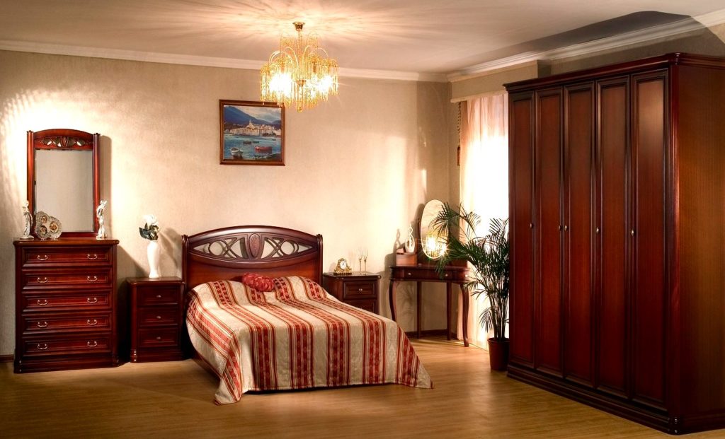 | Classic | For the manufacture of products, factories use high-quality MDF or solid wood. A characteristic feature is the use of mosaics, carvings, patterns and designs with a streamlined shape. All elements must be compatible with each other. Bedrooms made of solid wood do not go out of fashion for many years, as they are made of quality materials and are complemented by an equally expensive set. The color of natural wood always looks expensive and cozy. |