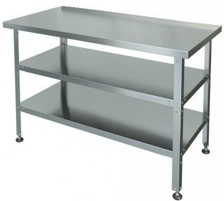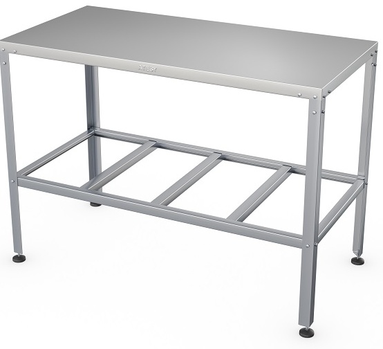 Installation on three tiers, the bottom two are shelves, the top one is the cutting area. The table top is reinforced with a laminated chipboard substrate. The shape of the frame and the legs along the entire length are rectangular, at the end of the supports there are round end washers (height adjustable).