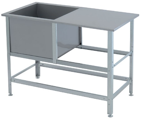 Domestic production of rectangular shape. The table top is equipped with small sides on 3 sides. There is a rectangular built-in bathtub (horizontal position), a round hole on the right in the corner on the open side, which is intended for a container that collects waste. The whole frame is made of metal, resistant to corrosion (does not rust). The working surface is reinforced from the inside with a sheet of laminated chipboard (chipboard).