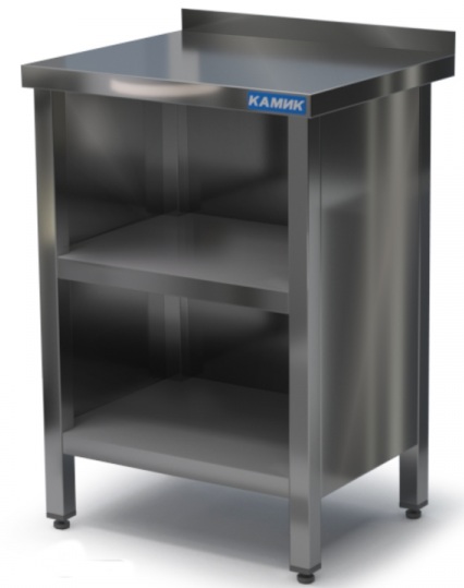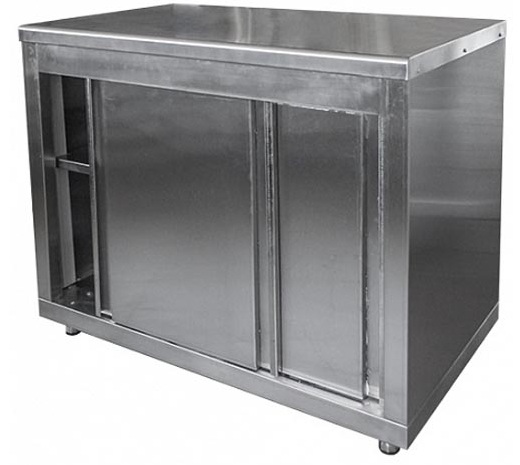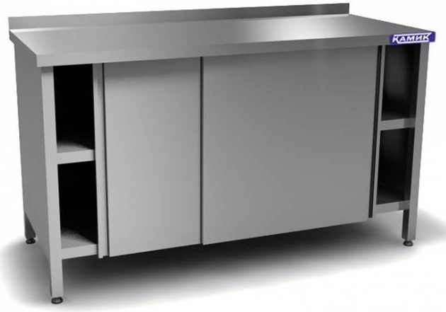 Equipment with a table top with a side board, closed on three sides with metal plates. In front, the frame is equipped with shelves and sliding compartment doors. On each door, along the edges, to the full height, there is a built-in handle (concave embossing - groove). The installation can be adjusted to any surface (even, with defects), thanks to the rotating tips, which are safe for flooring.