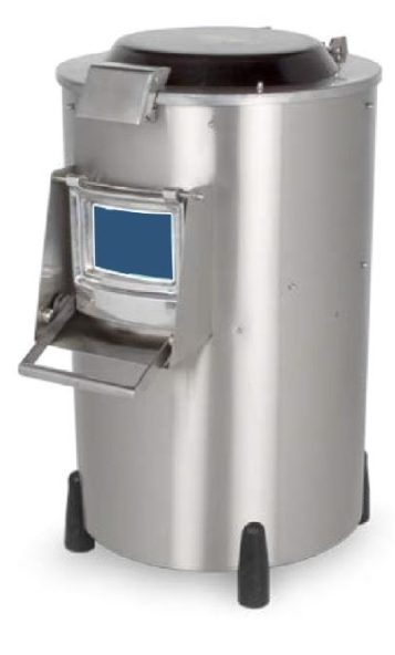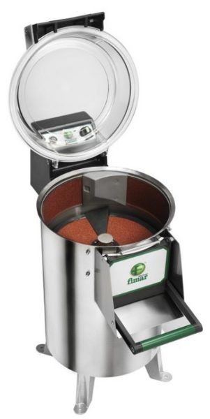 Potatoes are immersed in the machine through a special window into a large bowl. Then a small amount of water is poured so that the potatoes are washed during peeling. After the machine turns on, the bowl starts spinning quickly. Because the bowl is covered with a unique material, when the potatoes touch the wall, the peel will begin to peel off, thus cleansing. After cleaning, the residues are sent further to the residual container.