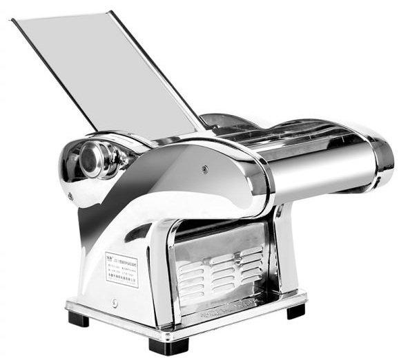 Dough sheeter-noodle cutter in a metal case with a mirror surface, equipped with an electric drive, buttons and a rotary switch. Works from a regular outlet. Makes two types of noodles, in addition to it, you can make pasties, dumplings, lasagne and other dishes. The design is used in small industries, in cafes, restaurants, catering places, home kitchen.