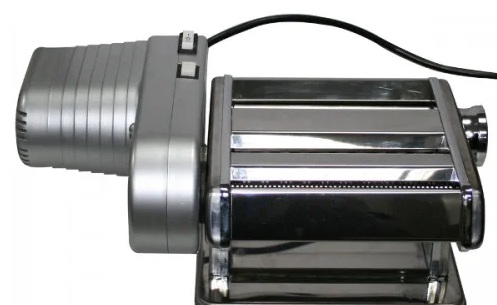 Table-type noodle cutter in a metal casing, resistant to corrosion. Works from the network. On the right side, at the top, there is a power switch (plastic, black), below, on the end part, there is a connector for connecting a power cable. The setting of the desired position of the knives and rolls is carried out using the rotary switch located on the left side. The set includes an attachment for lasagna sheets and cutting noodles of 2 types.