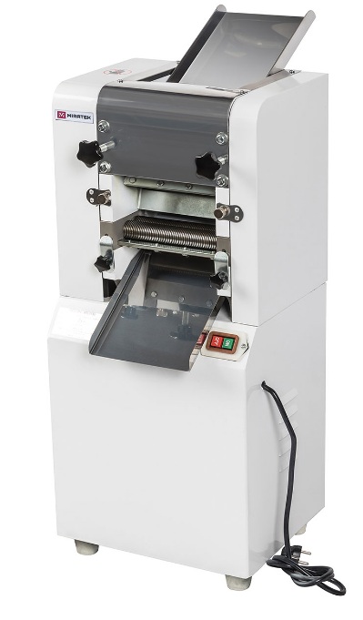 Machine for rolling and cutting dough with further formation of noodles. It is made of food grade chrome-plated stainless steel with plastic elements (start button, cylinder guards). On the left side there is a rotary knob with a corrugated lid, which ensures accuracy and comfort when setting the device. The smooth shaft does not cling or tear the dough.