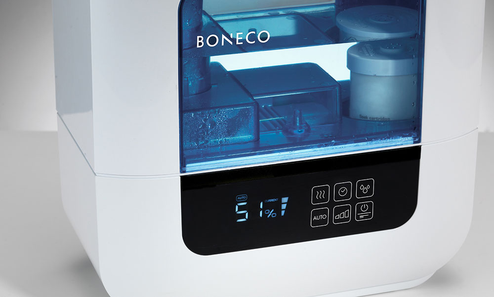 The small size of the device makes it easy to move the humidifier. Can be mounted on a wall or ceiling. With the help of an infrared lamp, the liquid is heated, and the atomized air stream is thoroughly cleaned of dirt and microbes. The model is equipped with an electronic humidity regulator and, after reaching the required level, switches off by itself.