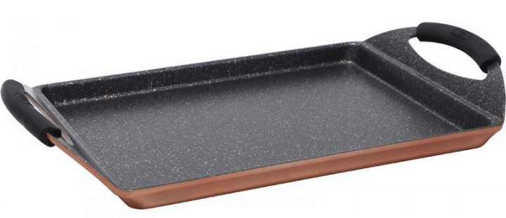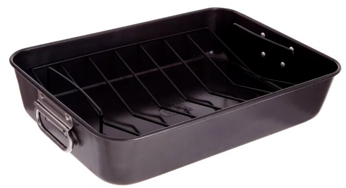 Rectangular sheet with high sides. Internal coating - non-stick Goldflon. The kit is completed with a plastic cover and two handles (easy to carry).