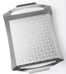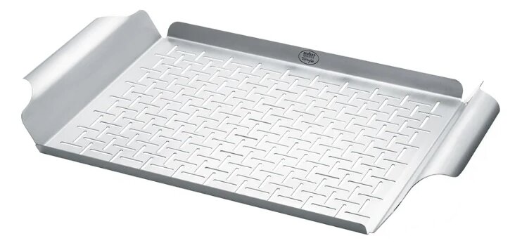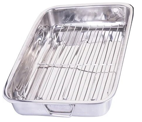 Rectangular shape, silver color. There are two side handles, grooved bottom. On the sides there are rectangular depressions. Complemented with a removable grill.