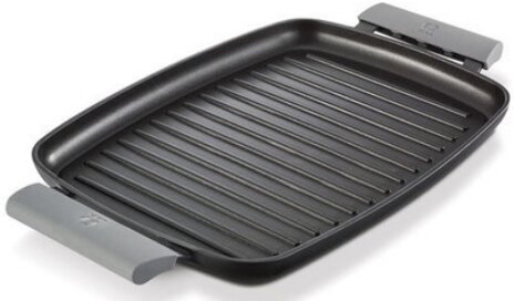 The product is rectangular, black, with a flat bottom. There are high sides, two silver side handles. Features non-stick Whitford coating, removable grill.