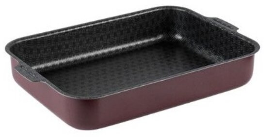 Rectangular shape. Two colors of the outer layer - burgundy, blue. The inner non-stick layer is black. You can bake whole poultry, rabbit carcasses, large pieces of tenderloin. Suitable for casseroles, meatballs, cereals with sauce.