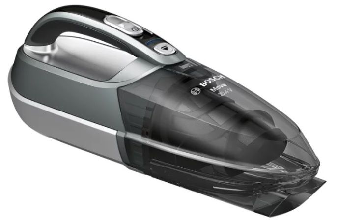 A handheld vacuum cleaner in a gray plastic case, has an oblong shape with a narrowed front, which allows you to suck out debris and dust from hard-to-reach places. In addition, there is a crevice nozzle. The device is powered by a battery, it is equipped with a cyclone filter. There are two buttons on the handle: one for turning the device on and off, the other for detaching the attachment. The vacuum cleaner can be used to clean home furniture.
