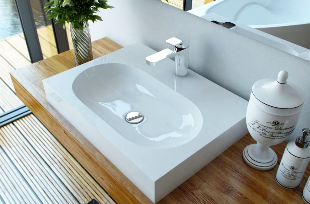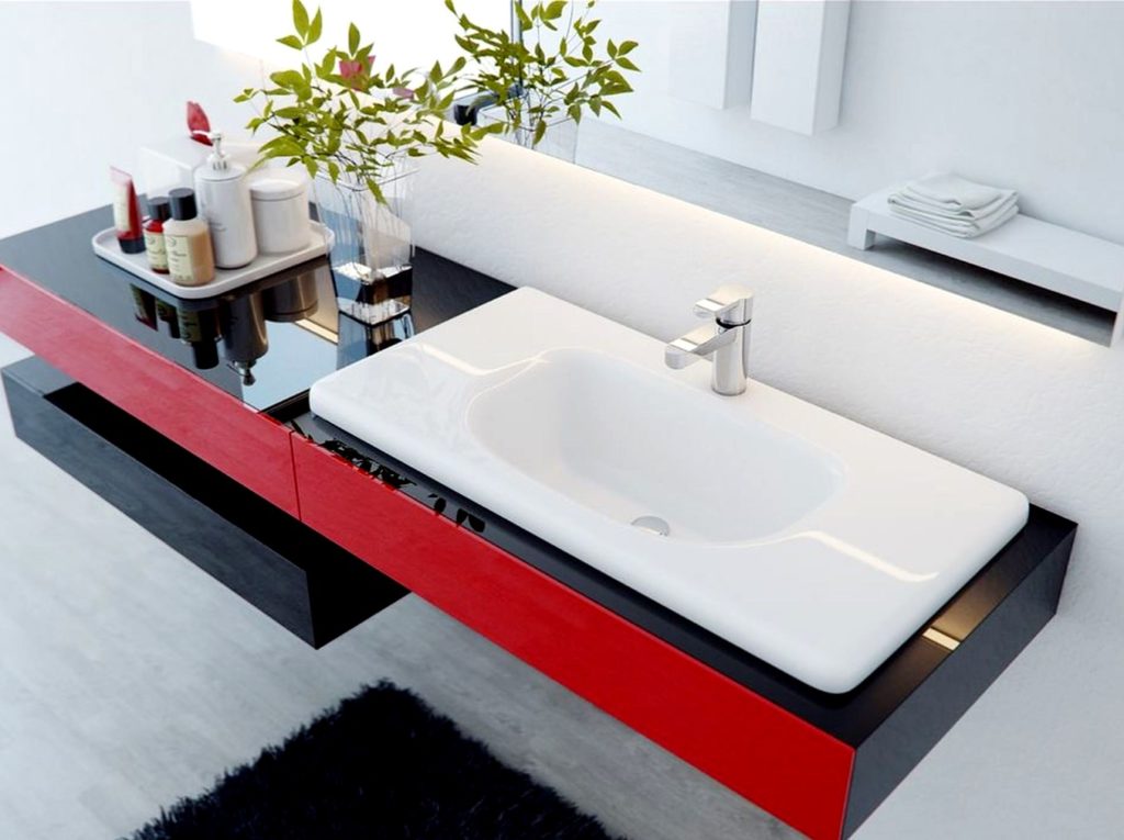 | Flat | Fits perfectly into a high-tech bathroom. The narrow and thin table top is equipped with a small cavity for collecting liquid. It will look organic in a small room. Granite, marble, glass and other materials are used for manufacturing. Water collection is carried out by means of a siphon of complex shape, which is hidden from view. Flaws include functionality. Installation of this design is unacceptable for daily use. Better for guest bathrooms where people wash their hands, but no more. |