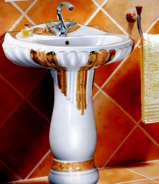 | On a pedestal | Often there are designs of oval, round and rectangular shapes. Popularly referred to as "tulip". It is assumed that the washbasin will be mounted on the wall, and a cabinet will be mounted under it, which will help to hide communications. Based on numerous reviews, this is the most preferable option. The advantage is ease of installation and reasonable cost. |