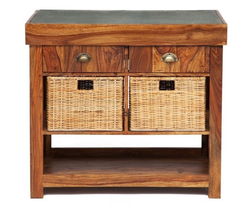 The furniture is made entirely of wood. Will decorate any kitchen. The table top is made of natural stone and will last a long time. The frame consists of two large wicker baskets for food. There are also two drawers for small kitchen and tools. The bottom shelf is often used to store crockery. Also, a special feature of the furniture is the presence of a special holder for towels. With the help of the device, the cooking process has become more comfortable and simple.