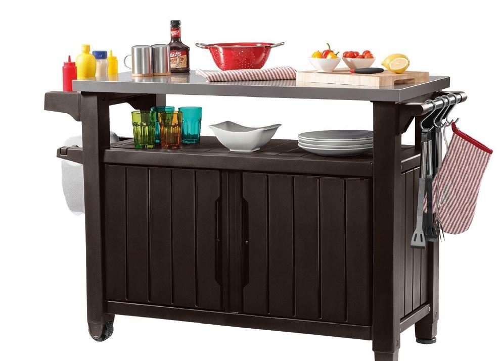The Italian manufacturer presents its user with a cutting table, which is made of durable plastic. The furniture is easy to move around the kitchen as the weight is low. An interesting exterior design will decorate any room. The cabinet has a stainless steel table top. A convenient shelf will allow you to place a large amount of food and dishes. You also need to pay attention to the hidden storage compartments. These compartments are closed with doors. Convenient hooks for towels and grabs on the side.