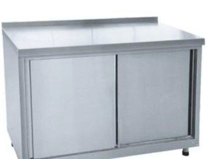 Universal furniture for cutting food. It can be used not only in the kitchen, but also in public places. It is recommended to install kitchen furniture near the sink for comfortable cleaning of dirty dishes. The table is made of stainless steel, which does not affect the quality of the products. The material is not susceptible to damage in prolonged wet conditions. It can be used for storing dishes, has high stability. If necessary, the board is removed, so the table can be used both in the center of the room and near the wall.