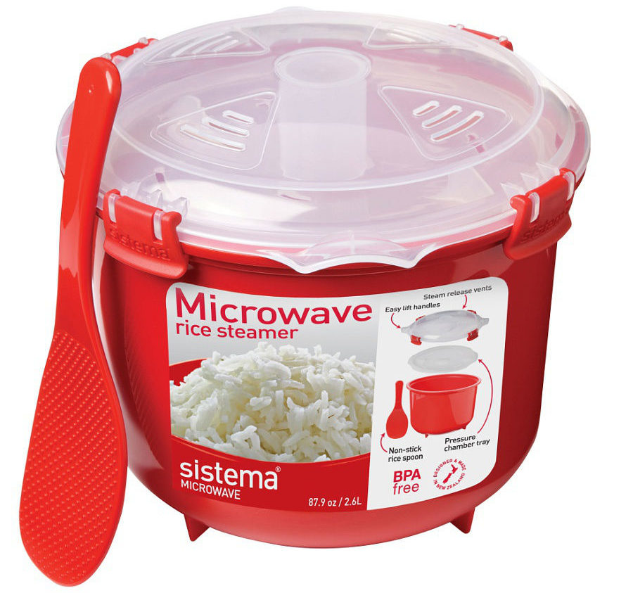 Product for cooking rice and other cereals. Can be used for cooking porridge or heating ready meals. The rice cooker is small and suitable for daily use. You can cook milk porridge or soup in the kitchen appliance. A feature of the product is the absence of a heating element. After placing all the necessary products, the container must be placed in the microwave. Special clamps on the lid ensure high-quality fixation. After the food is cooked, the temperature is kept for a long time. Bowl with a volume of 2.6 liters, covered with a non-stick layer. The water container is removable and can be cleaned with a dishwasher.