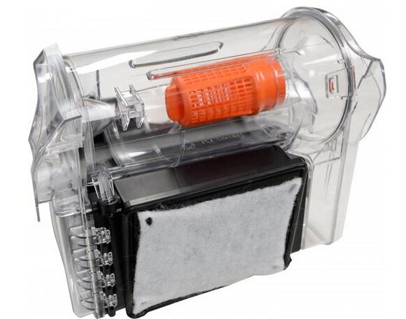 The waste container is filled with water. Dirty air is driven through the water - the dirt settles at the bottom of the tank. The main advantage is humidified, clean air after cleaning. Cons - flushing the tank after each cleaning.
