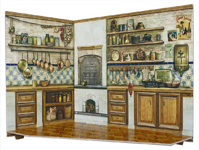 Often, these types of roomboxes are made independently from scrap materials. Walls, for example, can be made from a cardboard box, various figures and objects can be cut out of it, and here we present several samples that can be purchased in the store.